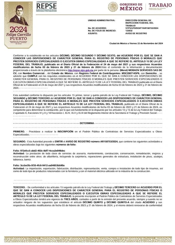 Somos una Empresa Moral que presta servicios especializados y/o ejecuta obras especializadas, por lo tanto, contamos con Inscripción vigente al Registro de Prestadoras de Servicios Especializados u Otras Obras Especializadas (REPSE).